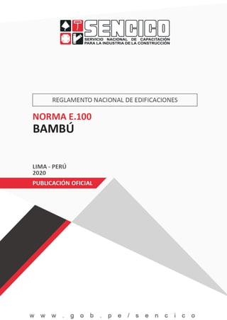 This document is a technical standard (Norma E.100 Bambú) from Peru that establishes guidelines for the design and construction of earthquake-resistant buildings using bamboo. It includes sections on general considerations, scope, applicable regulations, terminology, structural analysis and design methods, construction process, and maintenance. The standard applies to buildings up to two levels high with maximum live loads of up to 250 kg/m2, where structural elements are made of bamboo. It provides details on analyzing and designing bamboo components in bending, axial force, and lateral force/earthquake resistance.
