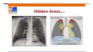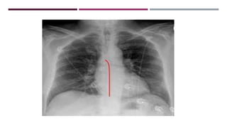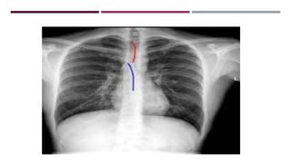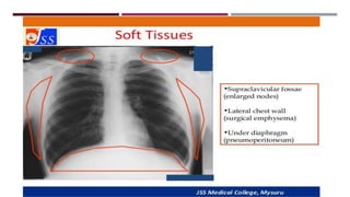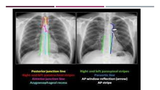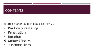 This document provides guidelines for performing and interpreting a normal chest x-ray. It describes recommended projections including PA, AP, lateral, and oblique views. Proper positioning, centering, penetration, and rotation are discussed. Key anatomical structures are defined, such as the mediastinum, heart, lungs, fissures, hila, and diaphragm. Common variations and pathological findings are outlined. The document aims to serve as a reference for radiologists in evaluating and diagnosing chest x-ray images.