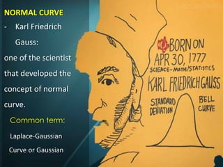 The document discusses the normal curve and standard scores. It defines the normal curve as a continuous probability distribution that is bell-shaped and symmetric. It was developed by Gauss and Pearson. The normal curve can be divided into areas defined by standard deviations from the mean. Standard scores are raw scores converted to other scales, including z-scores, t-scores, and stanines. Z-scores indicate the distance from the mean in standard deviations. T-scores are on a scale of 50 plus or minus 10. Stanines use a nine-point scale with a mean of 5 and standard deviation of 2.