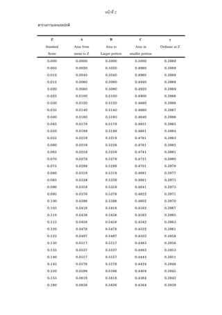 1. The document presents a table with standardized normal distribution values including the z-score, the areas under the normal curve to the left and right of the z-score, and the ordinate value at that z-score.