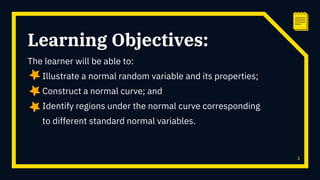This document provides information about the normal distribution and related statistical concepts. It begins with learning objectives and definitions of key terms like the normal distribution formula and how the mean and standard deviation affect the shape of the distribution. It then discusses properties of the normal distribution like symmetry and how it extends infinitely in both directions. The next sections cover areas under the normal curve and how to calculate probabilities using the standard normal distribution table. Later sections explain how to convert variables to standard scores using z-scores and the concepts of skewness and sampling distributions. Examples and exercises are provided throughout to illustrate calculating probabilities and percentiles for the normal distribution.