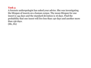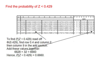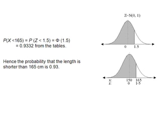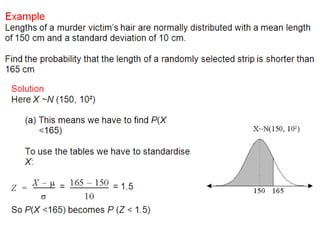 The document discusses the normal distribution and its key properties: bell-shaped and symmetrical around the mean, extending from negative to positive infinity with an area under the curve of 1. Approximately 95% and 99.9% of the distribution lies within 2 and 3 standard deviations of the mean, respectively. It also discusses how to calculate probabilities using the standard normal distribution where the mean is 0 and standard deviation is 1, and how to standardize other normal distributions.