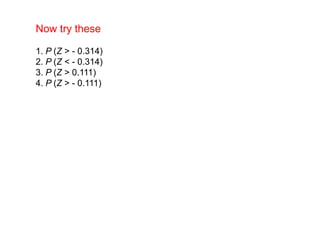 ![ExampleFind P (Z < 0.411) P (Z > - 0.411) P (Z > 0.411) P (Z < - 0.411)SolutionP(Z < 0.411) = [from tables 6591 + 4] = 0.6595P(Z > - 0.411) = P(Z < 0.411) = 0.6595 (from (above))P(Z > 0.411) = 1 – Φ(0.411) = 1 – 0.6595 = 0.3405P(Z < - 0.411) = P(Z > 0.411) = 0.3405](https://image.slidesharecdn.com/normaldistribution-110307043247-phpapp01/85/Normal-distribution-16-320.jpg)