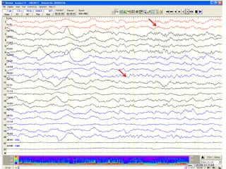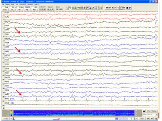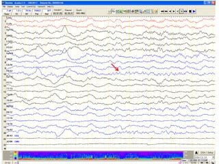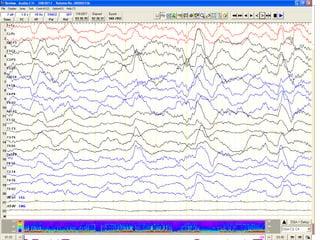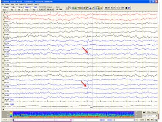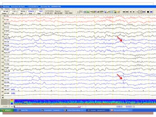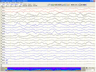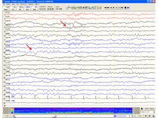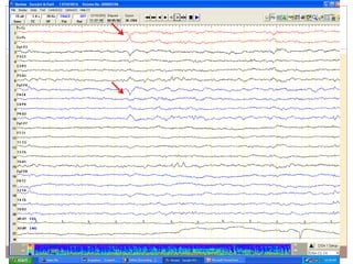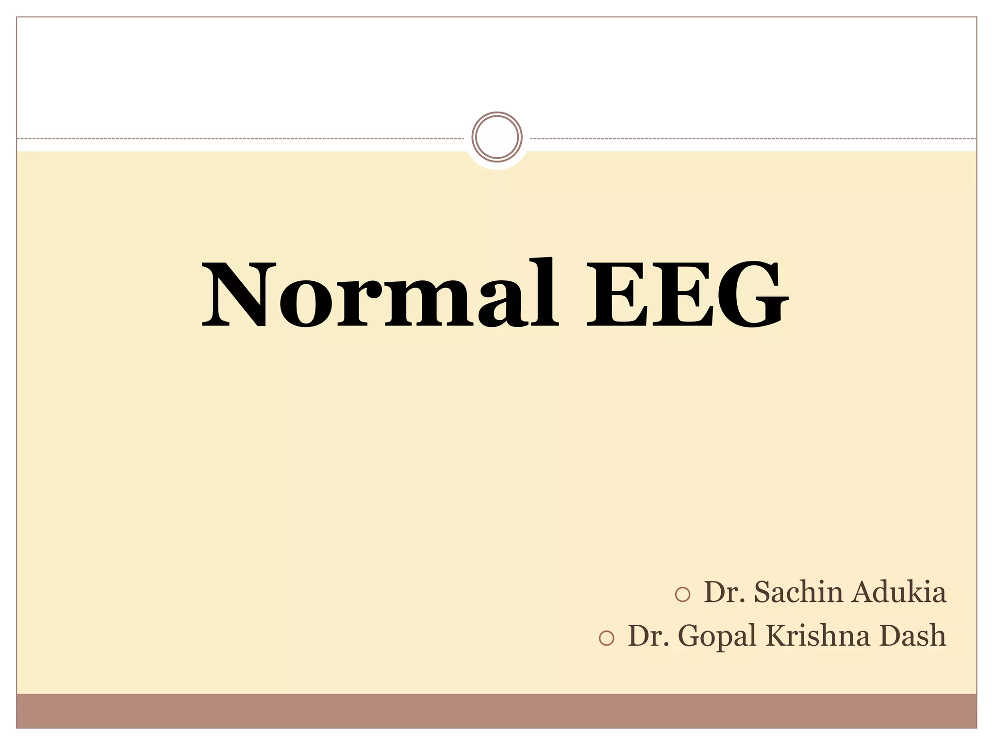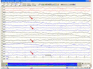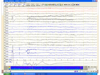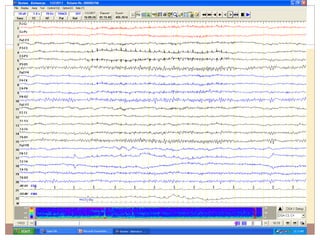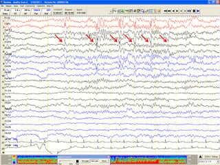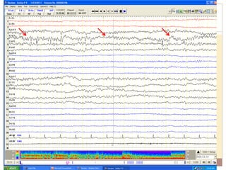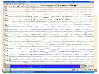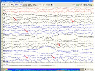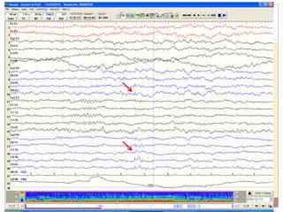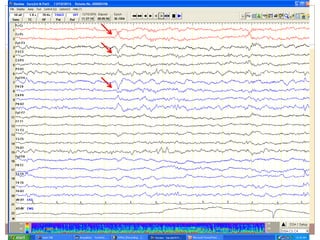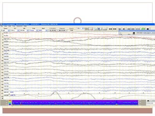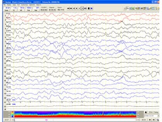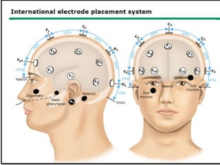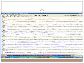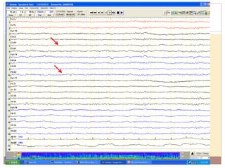 This document provides an overview of normal EEG patterns in adults. It begins with a brief history of EEG and then describes the basic electrical activity generated by the brain and how EEG recordings work. It outlines the normal frequency bands seen in EEG - delta, theta, alpha, beta and gamma. Specific normal EEG patterns like the alpha rhythm, vertex waves, sleep spindles and K-complexes are described. It also discusses benign variants and activation procedures. In summary, the document serves as a reference for the typical EEG patterns seen in healthy, awake and sleeping adults.