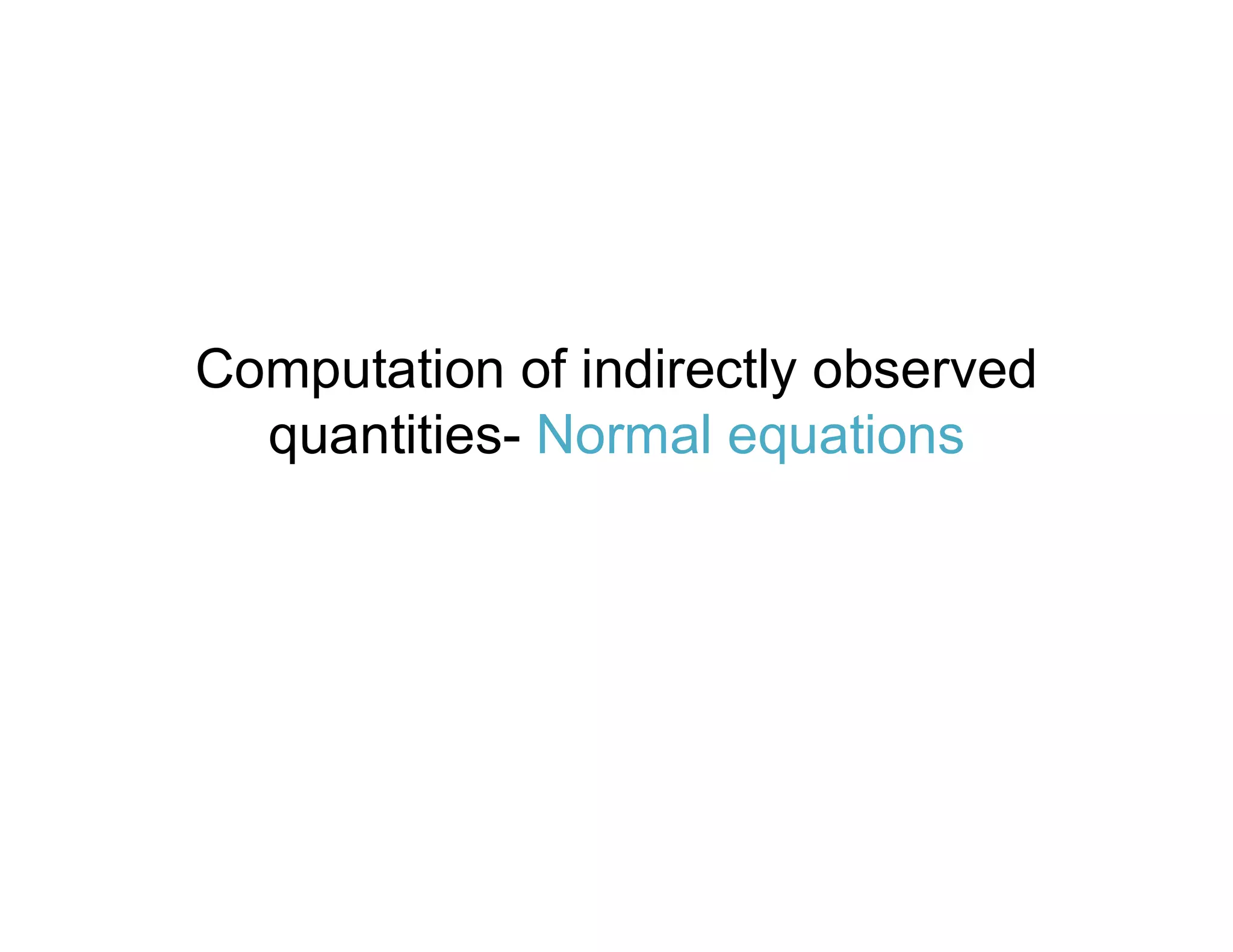 The document discusses normal equations, which are formed by multiplying each observation equation by the coefficient of the unknown quantity and adding the results. This allows the most probable values of the unknowns to be determined. The document provides an example of forming normal equations for three unknowns, x, y, and z, from three observation equations of equal and unequal weights. The normal equations are presented as the solution for determining the values of x, y, and z.