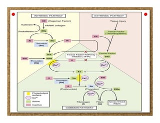 The document outlines the processes involved in normal hemostasis and how they are regulated, emphasizing the roles of endothelial cells, platelets, and coagulation factors. It explains the balance between antithrombotic and prothrombotic activities, detailing the mechanisms through which endothelial cells maintain blood in a fluid state and prevent excessive clotting. The document also describes the steps involved in hemostasis, including vascular constriction, platelet activation, and the coagulation cascade.