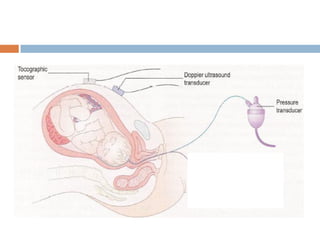 3. Management of the three stages of labor is outlined, including pain relief, monitoring, second stage delivery techniques, and third stage placental delivery.