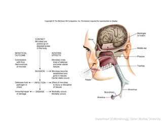 This document summarizes the normal microbial flora that inhabit the human body. It describes the different bacteria found in various parts of the body like the skin, oral cavity, intestines, urogenital tract. The document also discusses the benefits these normal flora provide, as well as potential issues like opportunistic infections when the normal flora is disrupted due to factors like antibiotic abuse, immune suppression, surgery or radiation. It introduces concepts like microeubiosis, microdysbiosis, and nosocomial infections.
