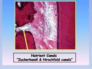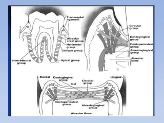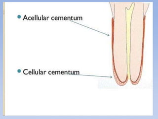 The periodontium is a specialized connective tissue that supports the tooth, comprising gingiva, cementum, periodontal ligament, and alveolar bone, each playing vital roles in maintaining oral health. Cementum, a calcified tissue that covers tooth roots, facilitates attachment to the alveolar bone and adapts to physical changes such as occlusal wear. The periodontal ligament connects teeth to the bone and undergoes constant remodeling, influencing tooth stability and health throughout life.