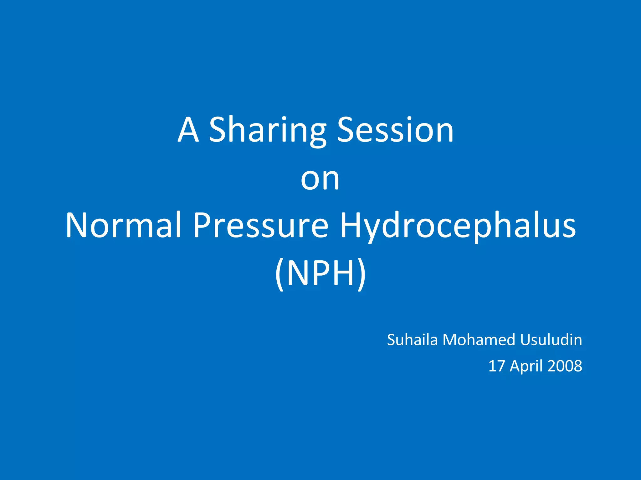 Normal pressure hydrocephalus (NPH) is a condition where cerebrospinal fluid (CSF) absorption is reduced, causing increased pressure in the ventricles of the brain. It typically affects elderly individuals and presents as a triad of symptoms - impaired gait, urinary incontinence, and cognitive impairment. Diagnosis involves MRI or CT scans showing ventricle enlargement. Treatment is usually surgical placement of a shunt to drain CSF from the brain ventricles to the abdominal cavity or heart, which can improve symptoms in many patients. However, shunt surgery also carries risks of complications.