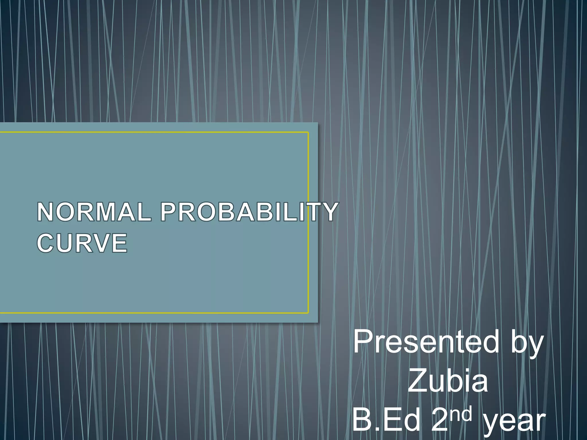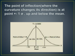 The document discusses the normal probability curve, also known as the Gaussian curve, and its characteristics including symmetry, unimodality, and specific statistical properties. It explains calculations for determining standard scores (z-scores), percentage of cases within a normal distribution, and comparisons of performance in tests across subjects. Additionally, it addresses practical applications of the normal distribution in research, measurement, and test construction.