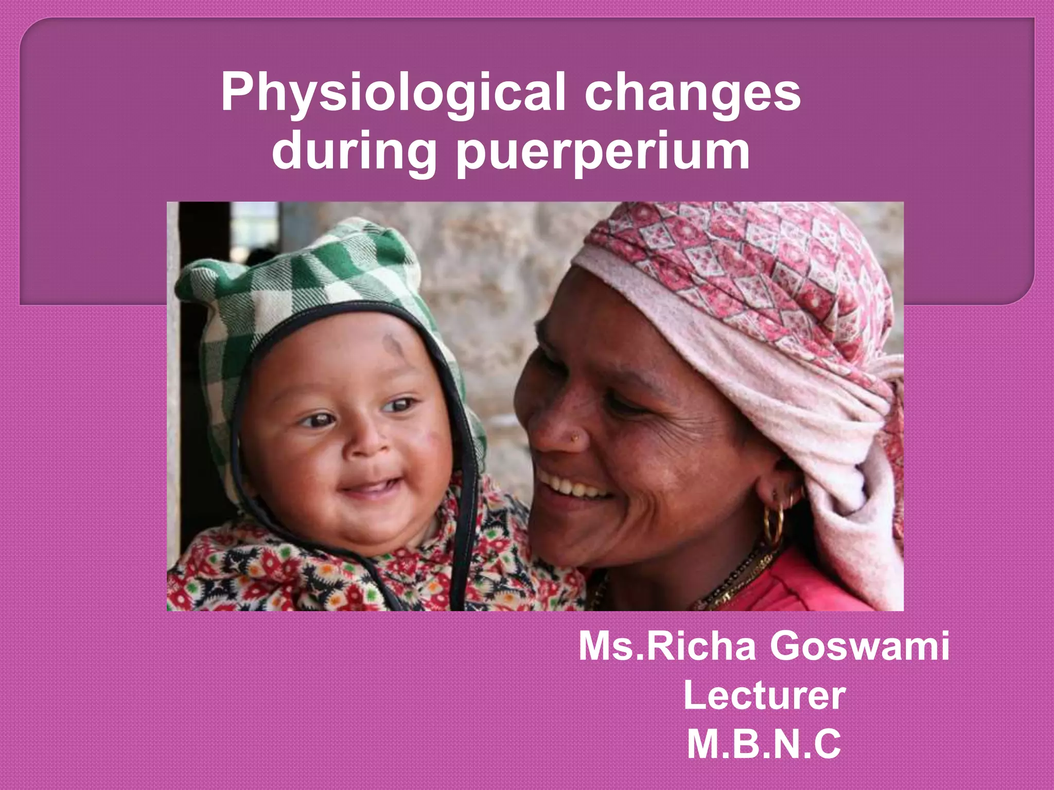The document summarizes physiological changes that occur during the postpartum period known as the puerperium. It lasts approximately 6 weeks as the body reverts back to its pre-pregnant state. This includes involution of the uterus, vagina, and other pelvic structures. Other changes include lochia discharge, temperature regulation returning to normal, changes in blood pressure and pulse, weight loss, fluid balance changes, and the return of menstruation being delayed in women who breastfeed.