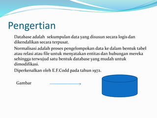 Dokumen tersebut membahas tentang normalisasi database, yaitu proses mengorganisasi data ke dalam tabel-tabel relasional untuk menghilangkan redundansi dan ketergantungan transitif. Normalisasi mencakup tiga tingkatan utama yaitu normalisasi ke-1, ke-2, dan ke-3, yang bertujuan membuat database lebih konsisten, efisien, dan fleksibel.