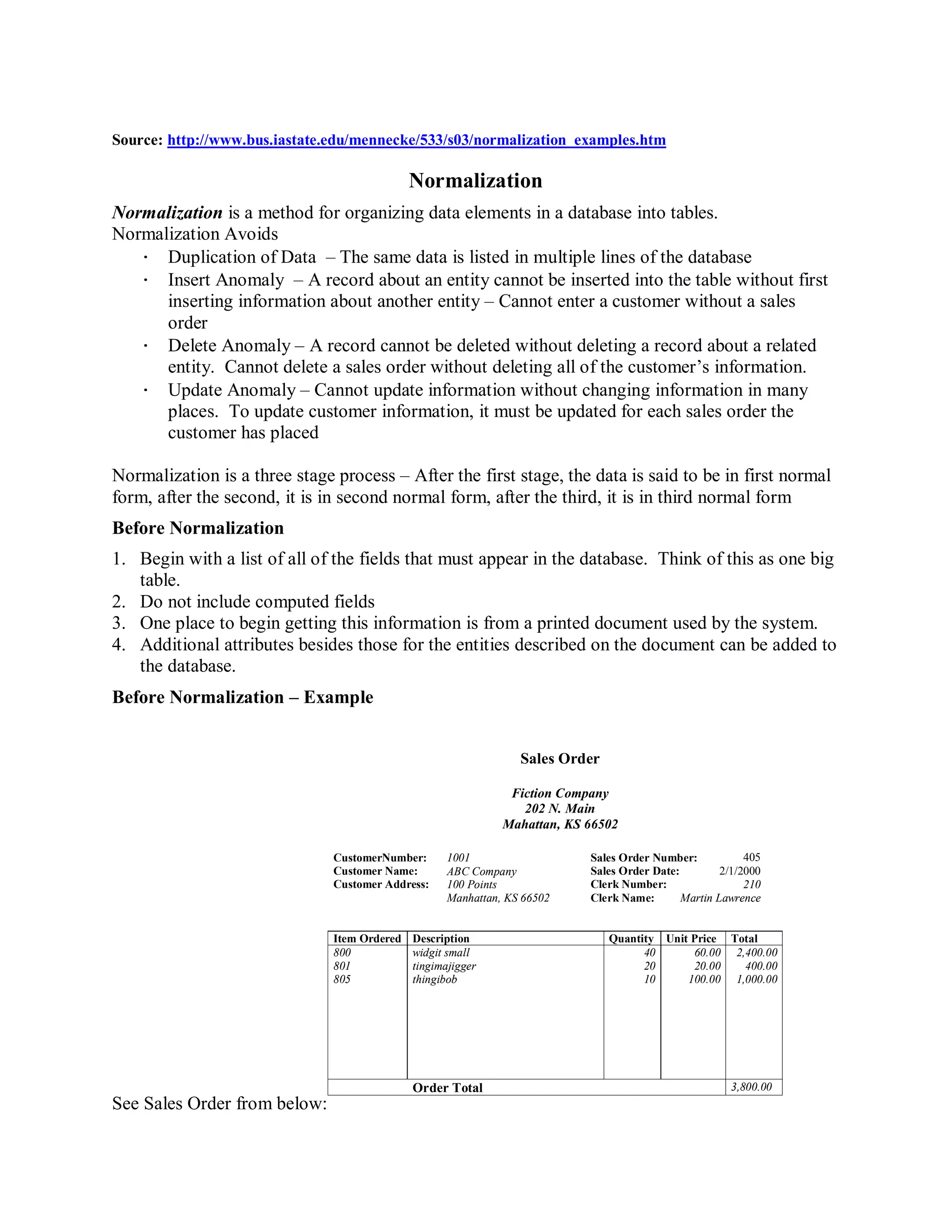 Normalization is a process to organize a database into tables to eliminate data duplication and inconsistencies. It occurs in three stages - first normal form removes repeating groups into new tables, second normal form removes partial dependencies into new tables, and third normal form removes transitive dependencies into new tables. An example database is normalized from a single table into multiple tables in third normal form to avoid problems like data repetition, delete and update anomalies.