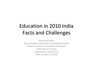 This document provides an overview of education in India in 2010, outlining key demographic, economic, and political trends impacting the system. It summarizes the structure of India's education system from elementary through tertiary levels and highlights some of the main challenges, such as high dropout rates, teacher absenteeism, lack of facilities/resources, and disconnect between vocational training and industry needs. The document examines these issues across different levels of schooling in India.