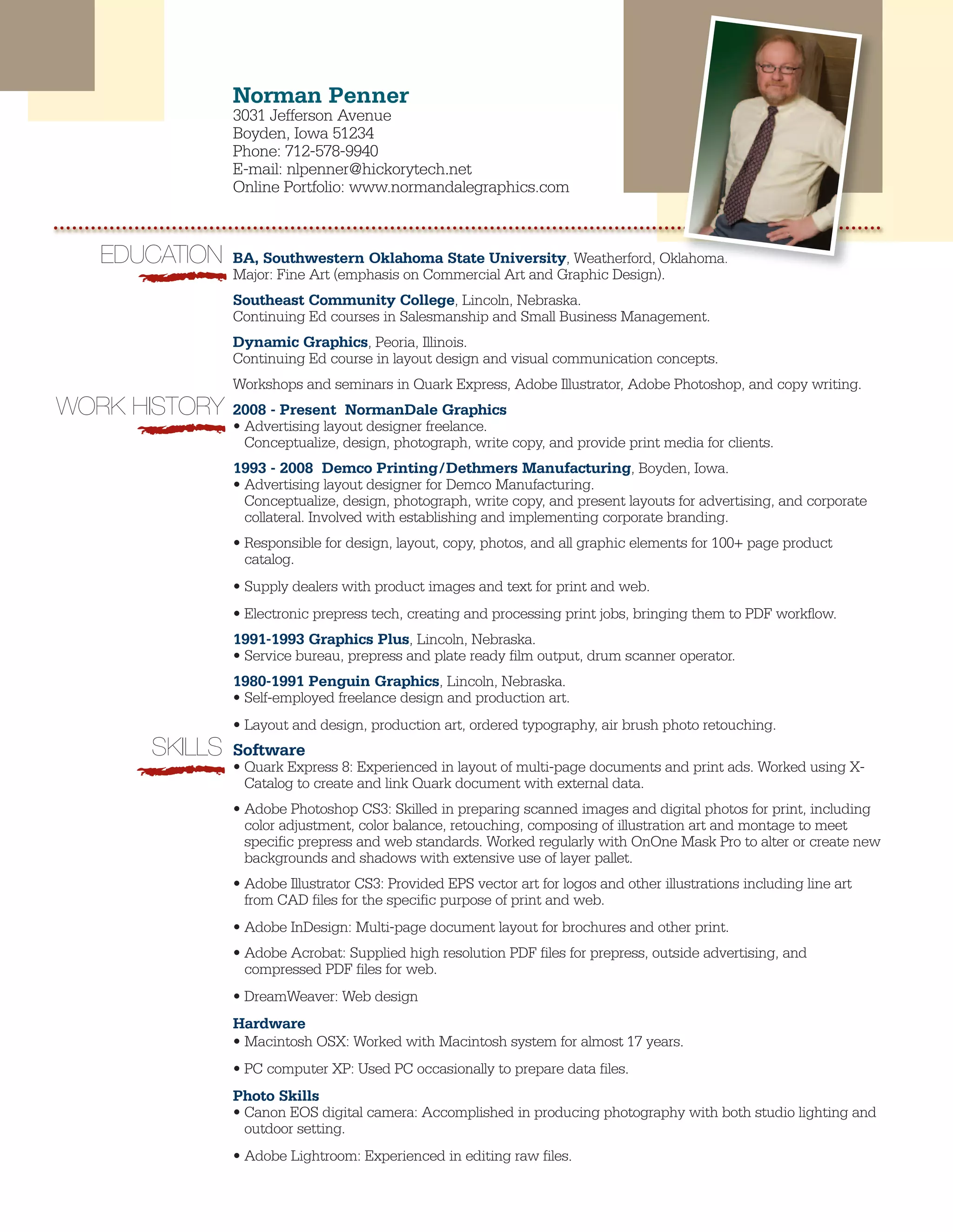 This document is a resume for Norman Penner that provides information about his education, work history, and skills. It summarizes that Norman received a BA in Fine Art with an emphasis on Commercial Art and Graphic Design. He has over 20 years of experience as a freelance graphic designer and over 15 years of experience as an advertising layout designer for Demco Printing. His skills include expertise in Adobe design software like Photoshop, Illustrator, and InDesign as well as Quark Express for layout.