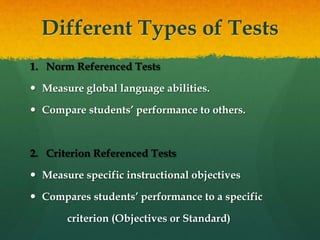 The document outlines the differences between norm-referenced tests (NRT) and criterion-referenced tests (CRT) in language programs. NRT measures overall language abilities and compares student performance against peers, while CRT evaluates specific instructional objectives. The document emphasizes the significance of choosing the appropriate test type for proficiency, placement, achievement, and diagnostic decisions in educational settings.