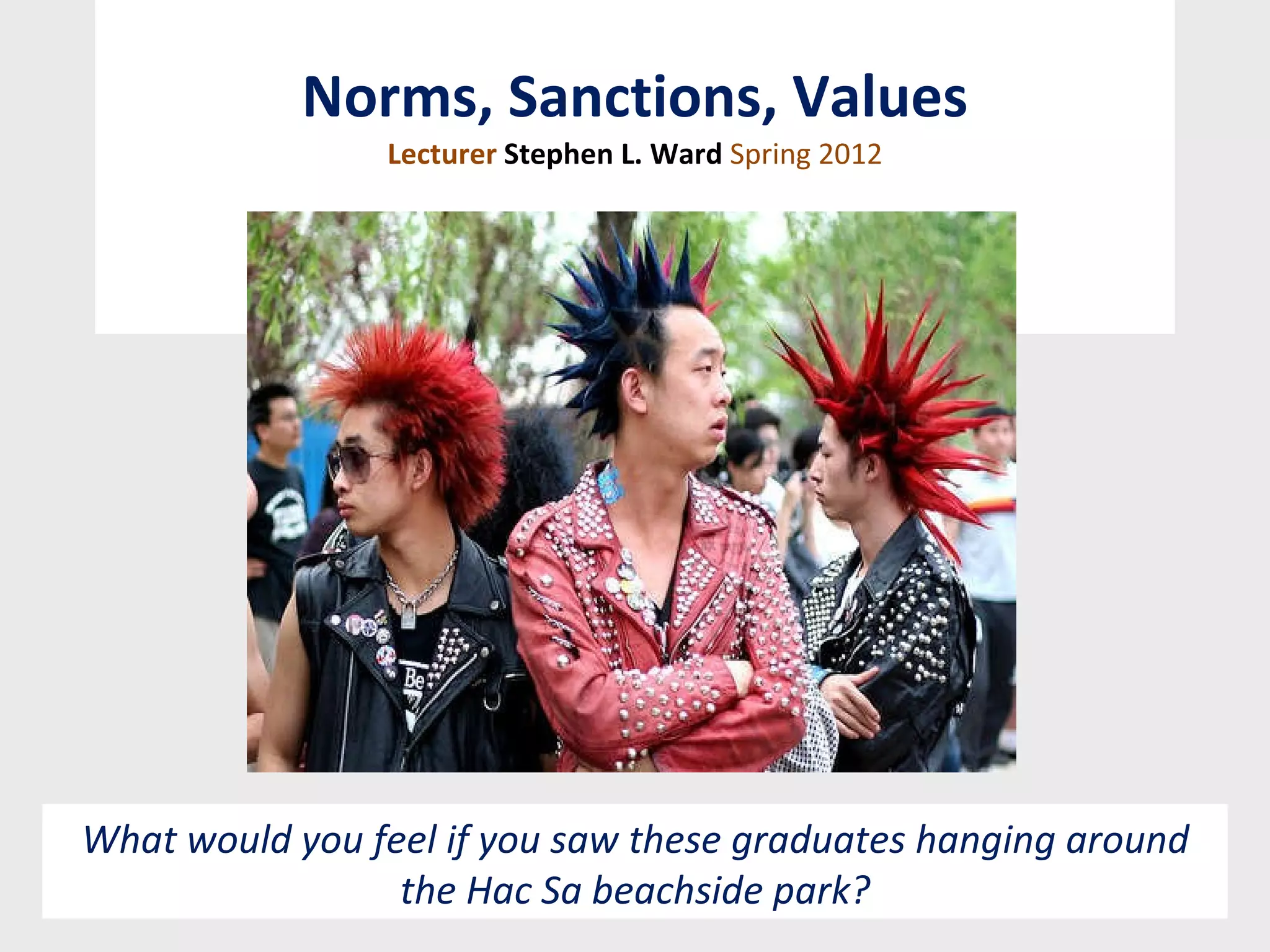 This document discusses societal norms, sanctions, and values. It defines norms as standards of behavior maintained by a society, and classifies them as either formal (mores) or informal (folkways). Mores are highly cherished principles that demand obedience and have severe penalties for violations. Folkways govern everyday behavior. Sanctions are penalties for norm violations or rewards for conformity, and must be detected to take effect. Norms and sanctions reflect and reinforce a culture's priorities and values.