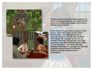 The document is a chapter from "The Norringtons: A Legacy" story. It follows multiple characters. Sebastian continues adjusting to his strange situation in Victorian England. Abigail introduces her mother to her suitor Barrington Finch, hoping for her parents' approval to court. Her mother takes a liking to Barrington and agrees to help convince Abigail's reluctant father.