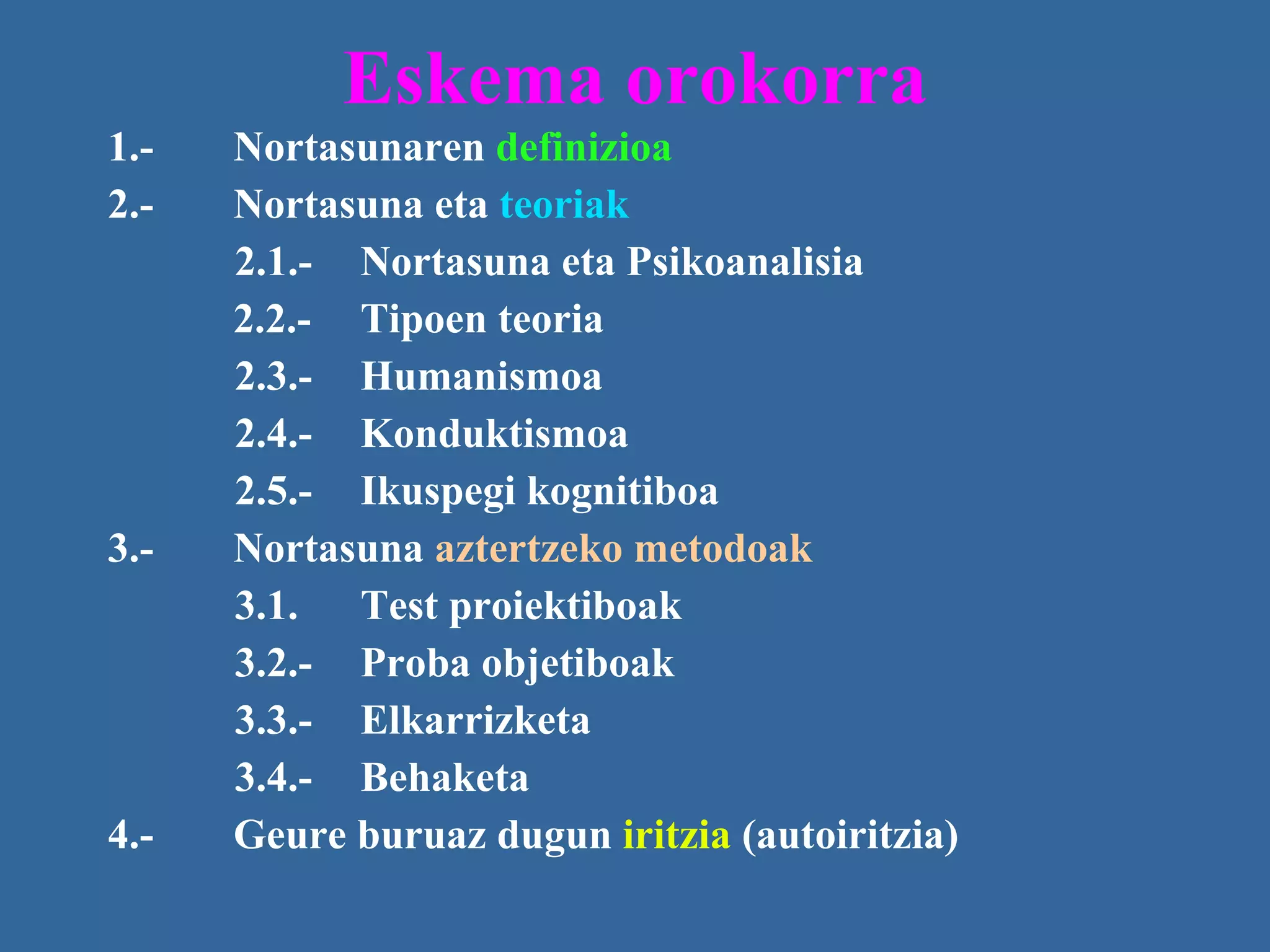 Eskema orokorra 1.-Nortasunaren definizioa 2.- Nortasuna eta teoriak 2.1.- Nortasuna eta Psikoanalisia 2.2.- Tipoen teoria 2.3.- Humanismoa 2.4.- Konduktismoa 2.5.- Ikuspegi kognitiboa 3.- Nortasuna aztertzeko metodoak 3.1. Test proiektiboak 3.2.- Proba objetiboak 3.3.- Elkarrizketa 3.4.- Behaketa 4.- Geure buruaz dugun iritzia (autoiritzia)