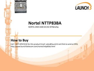 The document describes the Nortel OME 6500 OC192 XFP transceiver. It provides details on how to purchase the product from Launch 3 Telecom, including payment and shipping options. Launch 3 Telecom offers repair services and warranties for the product.