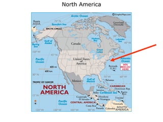 North America includes 23 independent countries as well as island territories in the Caribbean Sea. Canada, the United States, and Mexico are the largest and most populated countries. Central America connects North America to South America and includes 7 countries. The continent has diverse geographic features like mountain ranges such as the Rocky Mountains and Appalachians, plains, forests, and coastal regions.