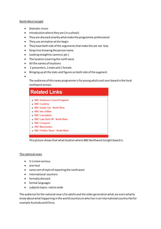 - BBC Northwest Tonight focuses on local news for the northwest region of England and is aimed at young adults in that region. It uses animation and interviews to present balanced arguments on issues.