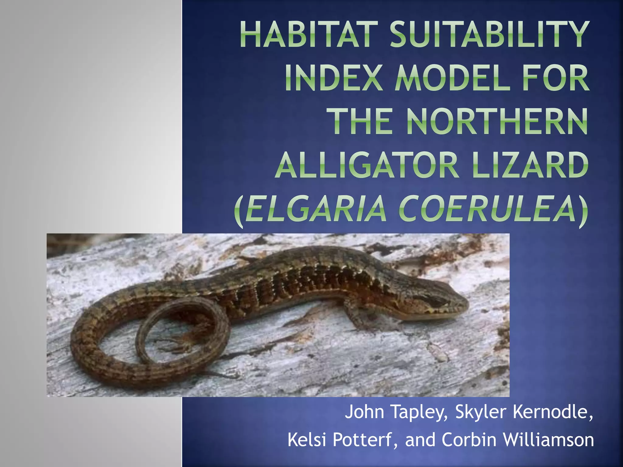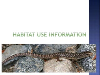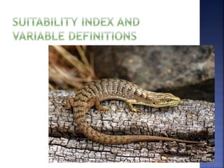 This document provides information on the habitat use and habitat suitability index model for the northern alligator lizard. It describes the species' preferences for grassy, bushy and rocky areas within forested areas. It also outlines variables used in the habitat suitability index model such as average distance to forest edge, percent rock cover, percent shrub canopy cover and percent forest canopy cover. The document indicates the model requires field testing but can help prevent potential habitat degradation and fill knowledge gaps regarding habitat selection for this species.