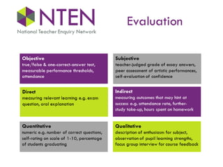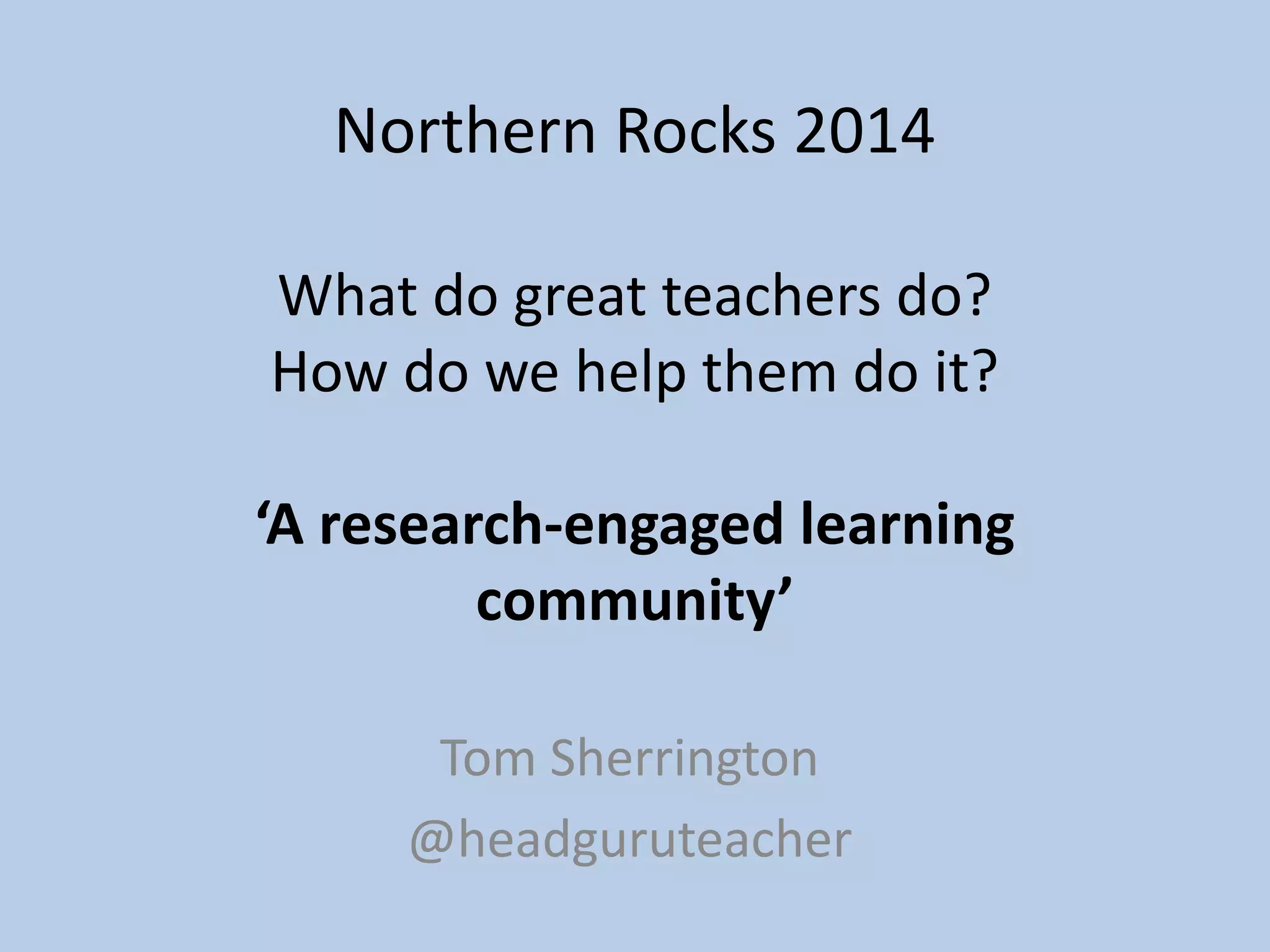 This document discusses creating the optimal conditions for great teachers. It argues that schools should focus on getting the basics right while cultivating a culture of continuous learning and improvement. This includes implementing intelligent performance reviews, tailored professional development, and fostering a research-engaged community. Teachers should engage with research by reading it and sharing learning. They should also engage in research by undertaking projects to test ideas, collect evidence, and disseminate conclusions. The goal is to help teachers thrive through purpose, challenge, autonomy, growth and recognition.