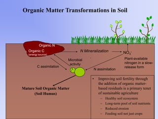 The document discusses the potential for maximizing resource recovery from biosolids, emphasizing the importance of organic matter in improving soil fertility and supporting sustainable agriculture. It details the benefits of anaerobic digestion for energy recovery, potential savings in fertilizer use, and trends in wastewater solids management in the U.S. The document concludes by identifying future opportunities for biosolids utilization, suggesting that increased recycling through digestion can lead to significant environmental and economic benefits.