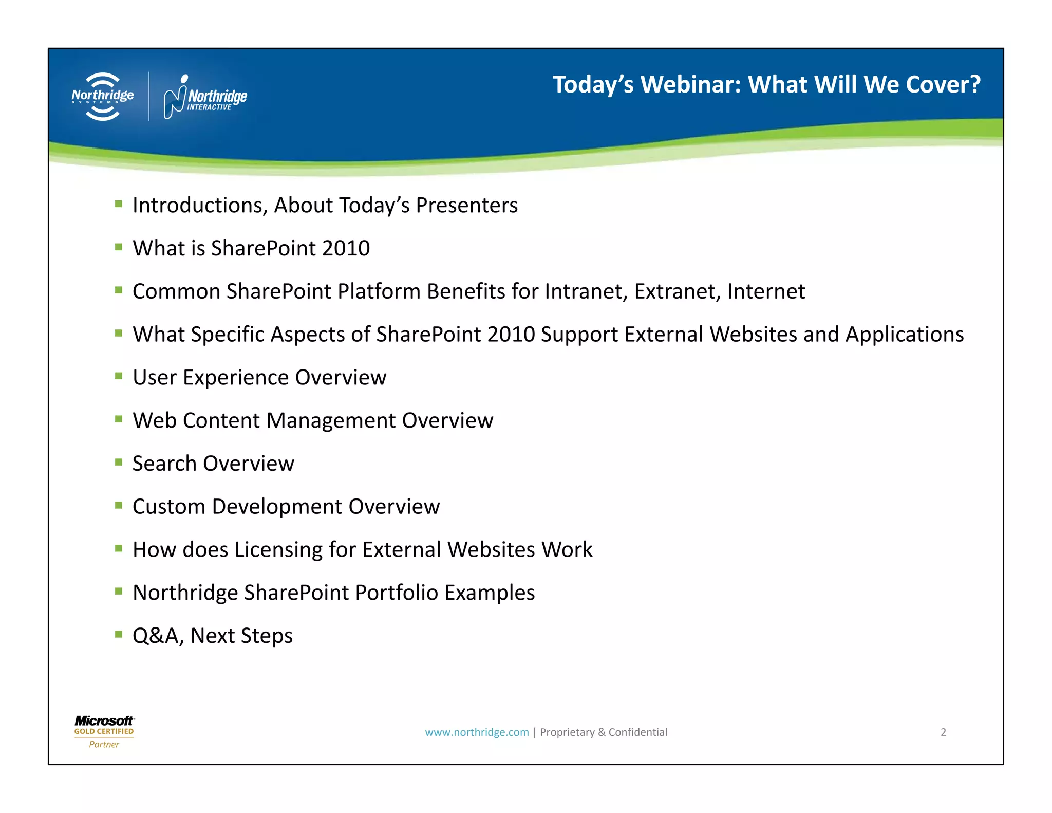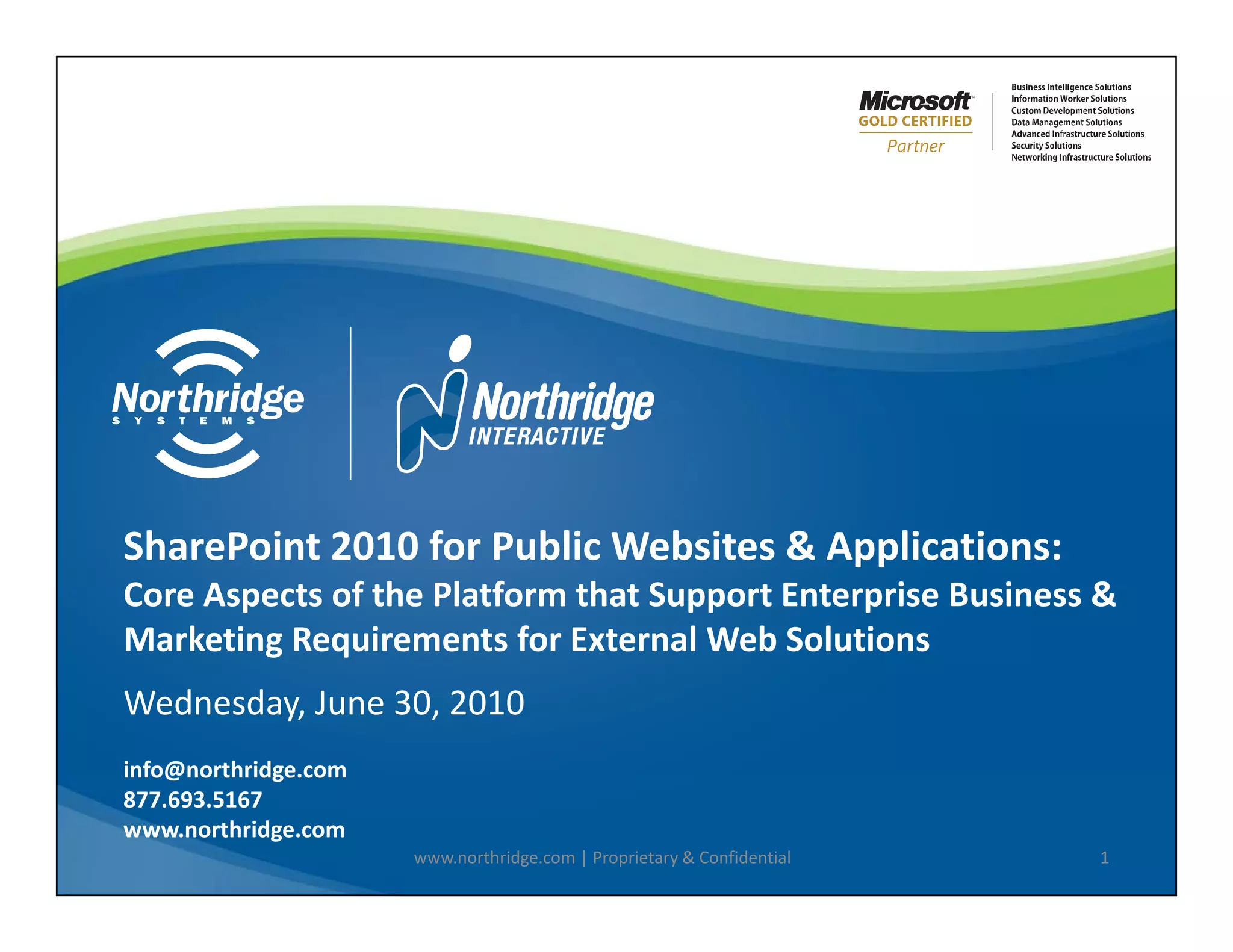 The document provides an overview of SharePoint 2010, emphasizing its features for public websites and applications, such as web content management, user experience design, and search capabilities. Northridge, the presenting company, outlines SharePoint's benefits for external web solutions and highlights their expertise in leveraging Microsoft's technology. The presentation includes topics like the architecture of SharePoint, custom development support, and integrating various digital marketing and analytics tools.