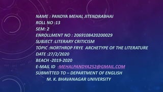 This document provides an overview of Northrop Frye and his theory of archetypal criticism. It discusses Frye's background and major works that established him as an influential literary critic. The document then defines archetypal criticism and its origins in social anthropology and psychoanalysis. It explains Carl Jung's concept of the collective unconscious and how Frye adapted this idea. Finally, it provides examples of archetypes like symbols, characters, and recurring narratives that can be analyzed through an archetypal critical lens.