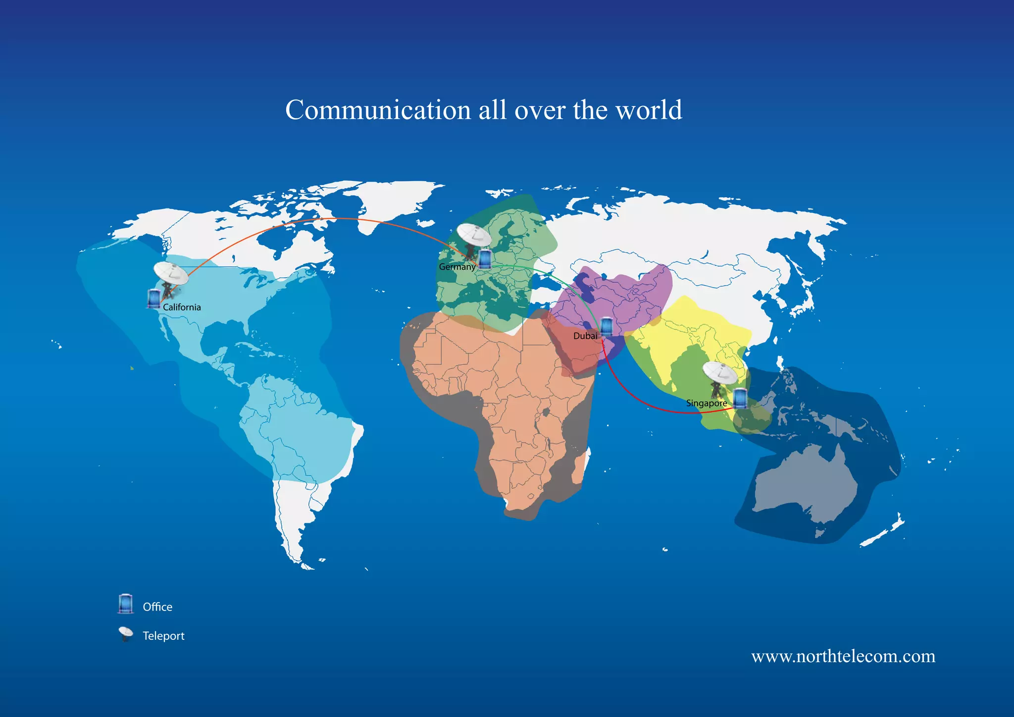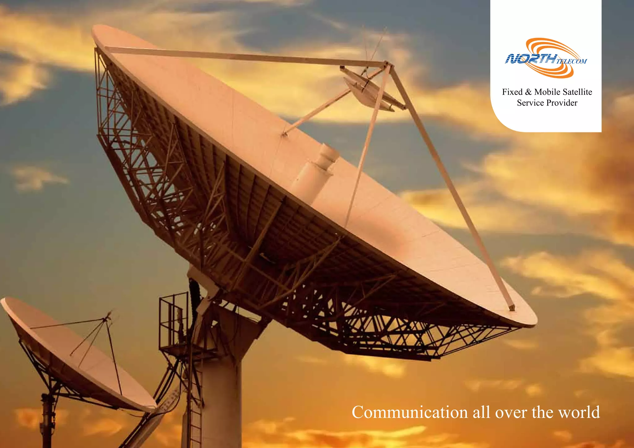 NorthTelecom is an international satellite communication services provider that offers fixed and mobile satellite services including broadband internet, private networks, media broadcasting, and GPS tracking via satellite. It has offices and teleports located in Singapore, Dubai, Germany, and California and provides services globally using satellites from multiple locations.