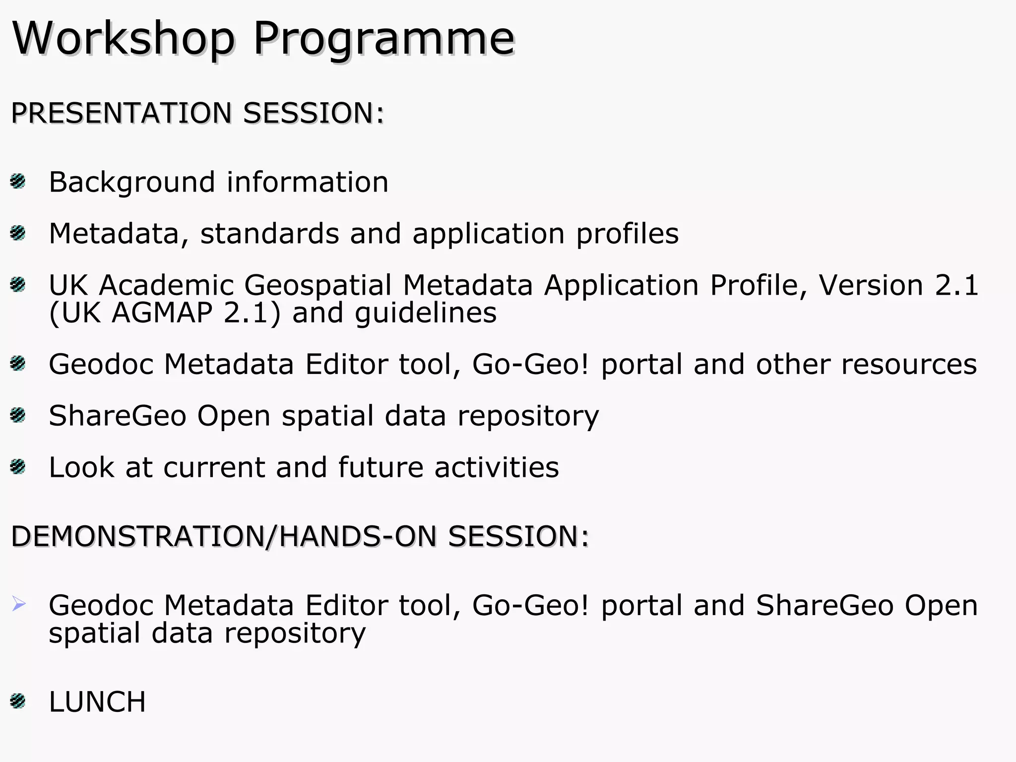 The document summarizes a workshop on geospatial metadata and spatial data. It discusses the importance of metadata for managing and sharing spatial datasets, providing key information about the data. It also covers metadata standards like FGDC, ISO 19115, and application profiles. The workshop includes presentations on the UK Academic Geospatial Metadata Application Profile and tools for creating metadata like the Geodoc Metadata Editor and Go-Geo portal.