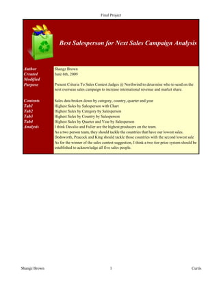 The document analyzes sales data from various salespeople to determine who should lead an overseas sales campaign. It finds that Davolio and Fuller had the highest overall sales. It also analyzes highest sales by category and country for each salesperson. The analysis recommends Davolio, Fuller, Dodsworth, Peacock, and King to target countries with the lowest current sales.