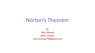 Norton's theorem states that any two-terminal linear dc network can be represented by an equivalent circuit consisting of a current source in parallel with a resistor. The theorem provides steps to calculate the equivalent current source (IN) and resistor (RN) values. First, remove the network and mark the terminals. RN is found by setting sources to 0 and measuring resistance between terminals. IN is found by returning sources and measuring short circuit current between terminals. The Norton equivalent circuit can then be drawn by replacing the original network between the terminals. Examples demonstrate applying the theorem to networks containing resistors and voltage/current sources.