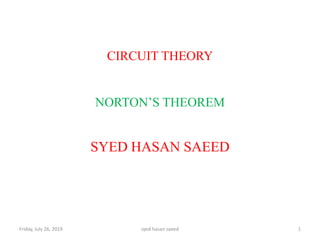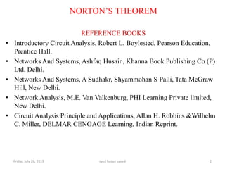 This document discusses Norton's theorem for circuit analysis. It begins by listing reference books on the topic. It then states that Norton's theorem allows any linear DC circuit to be replaced by an equivalent circuit with a single current source (IN) in parallel with a single resistance (RN). It provides the procedure to calculate the Norton equivalent current and resistance by opening independent current sources, shorting independent voltage sources, and calculating the current and resistance as seen by the terminals. An example problem demonstrates finding the current through a 3 ohm resistor using Norton's theorem.