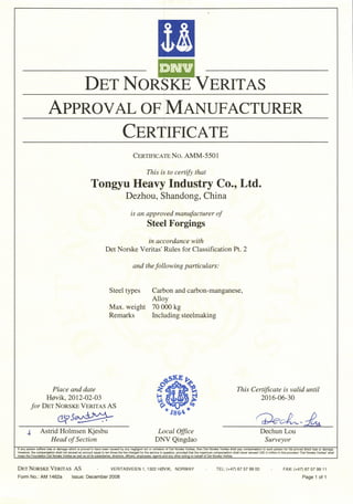 This document is a certificate from Det Norske Veritas (DNV) certifying that Dezhou Shandong Heavy Industry Co., Ltd. in Dezhou, Shandong, China is approved to perform steel forging according to DNV's rules for classification. The certificate is valid from 2012-02-03 to 2016-06-30. The certificate covers carbon and carbon-manganese steel types with a maximum weight of 70,000 kg, including steelmaking.