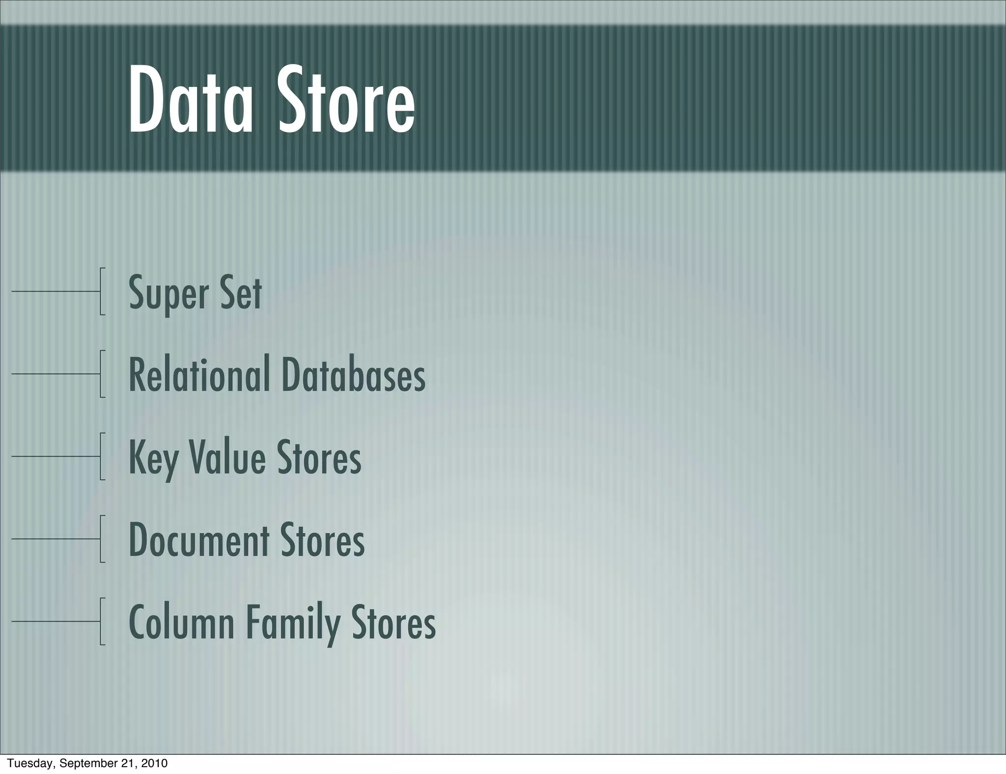 The document discusses different types of NoSQL data stores including key-value stores, document stores, and column family stores. It provides examples like DynamoDB, MongoDB, Cassandra and describes their data models, querying capabilities, replication strategies, and how they provide horizontal scalability and high availability. The goal of NoSQL databases is to overcome limitations of scaling relational databases by relaxing ACID properties and allowing more flexible schemas.