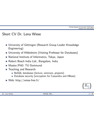 The document provides an overview of NoSQL databases, including various types such as graph databases, XML databases, key-value stores, and document stores. It emphasizes new requirements for managing complex and distributed data structures and the significance of alternative data models in modern applications. The content also discusses different database systems, their applications, and relevant open-source technologies.