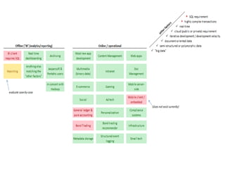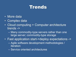 MongoDB and NoSQL use cases address trends of more and complex data, cloud computing, and fast application development. MongoDB provides horizontal scaling, ability to store complex data without pain, compatibility with object-oriented languages and frequent releases, high single-server performance, and cloud friendliness. However, it offers no complex transactions. Suitable use cases include high data volumes, complex data models, real-time analytics, agile development, and cloud deployment. Examples of users are given for content management, operational intelligence, metadata management, high-volume data feeds, marketing personalization, and dictionary services.