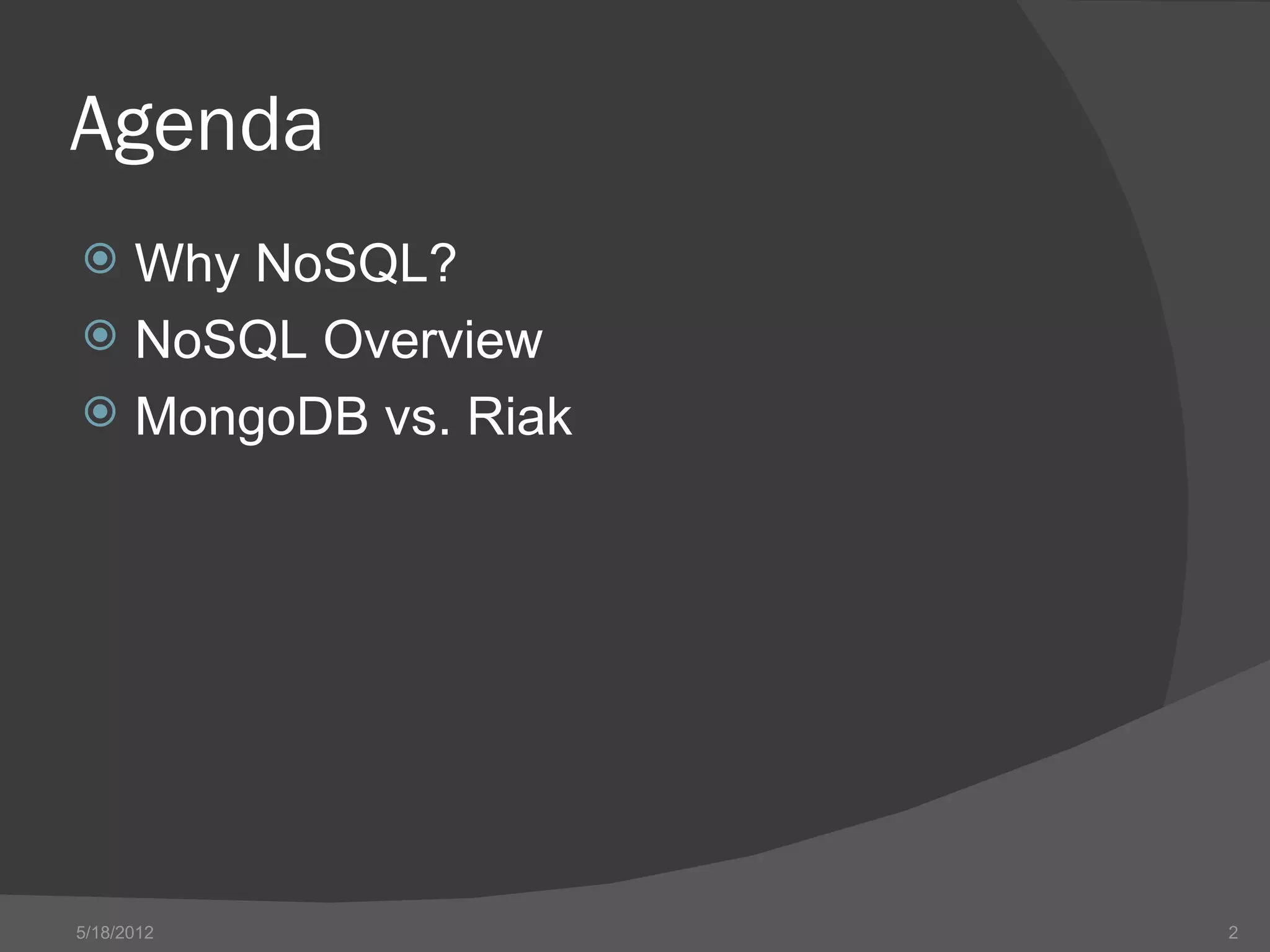 The document provides an overview of NoSQL databases, including their history and why they emerged. It discusses some key features of NoSQL databases like not requiring a fixed schema and not providing full ACID guarantees. The document then compares MongoDB and Riak on various aspects like their setup requirements, tooling support, driver support for CRUD operations, and their approaches to queries and ID generation.