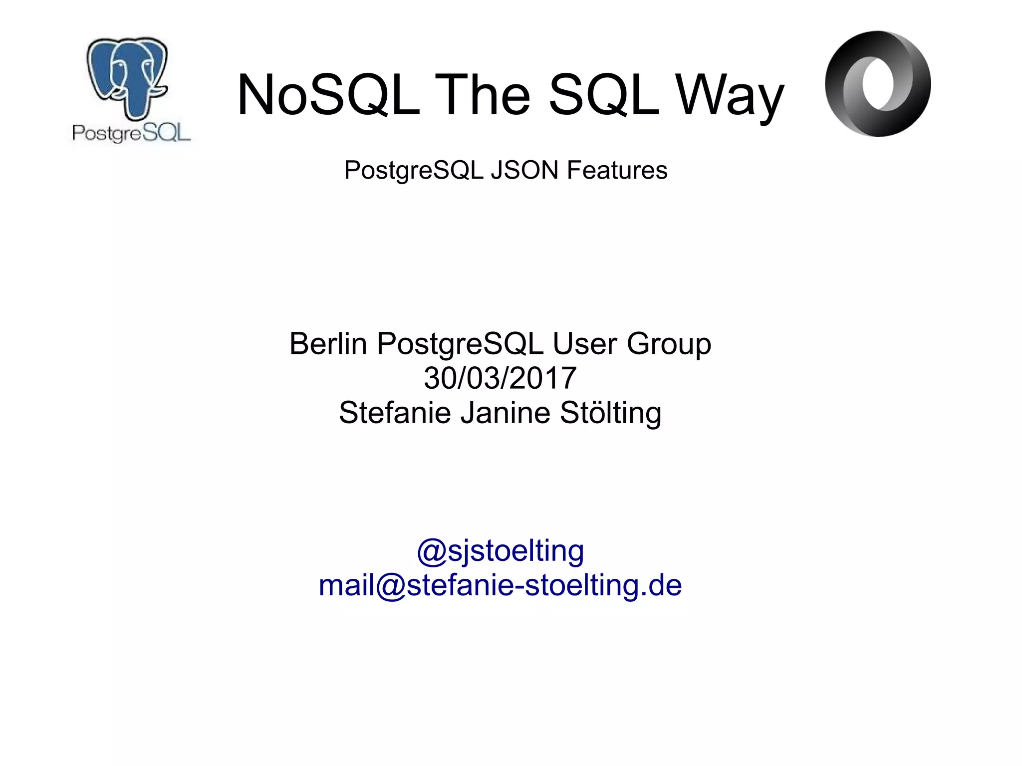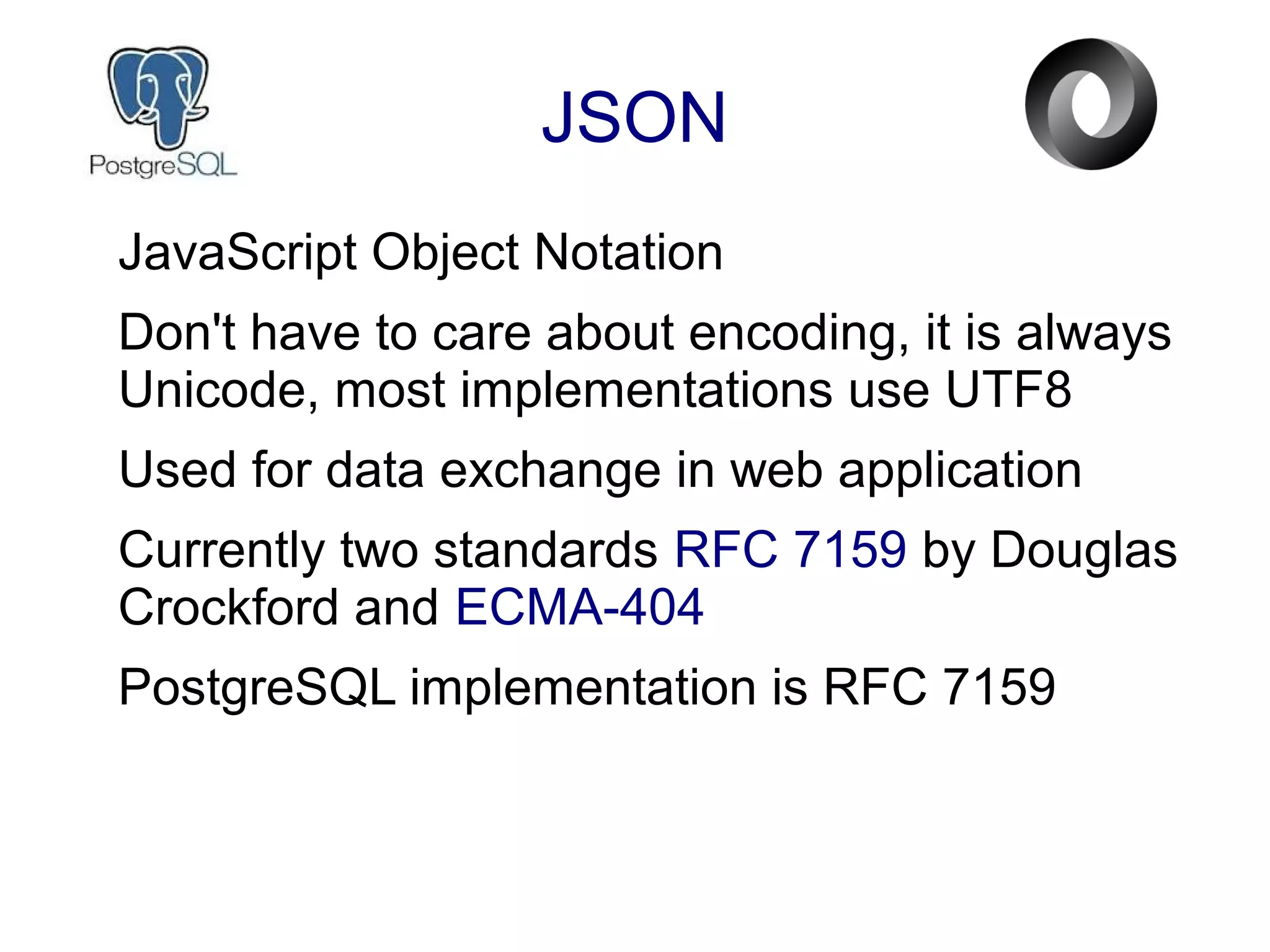 The document discusses PostgreSQL's JSON features, including data types like JSON, BSON, and JSONB, as well as various functions and operators introduced in recent versions. It presents practical examples of using JSON with the Chinook database and provides insights into indexing JSON data for improved query performance. Additionally, it covers creating views and triggers for managing JSON data in PostgreSQL.