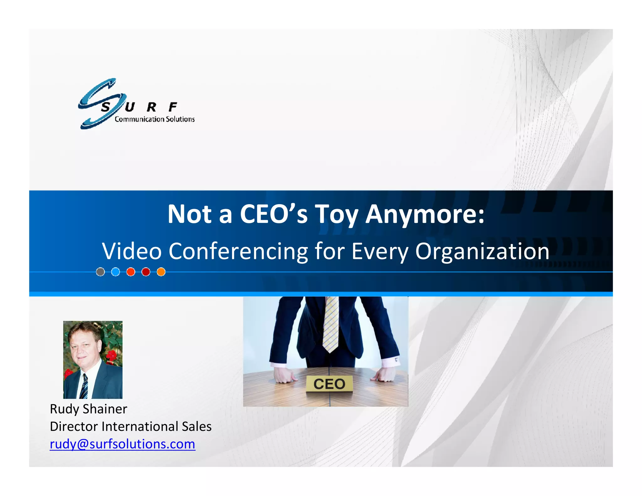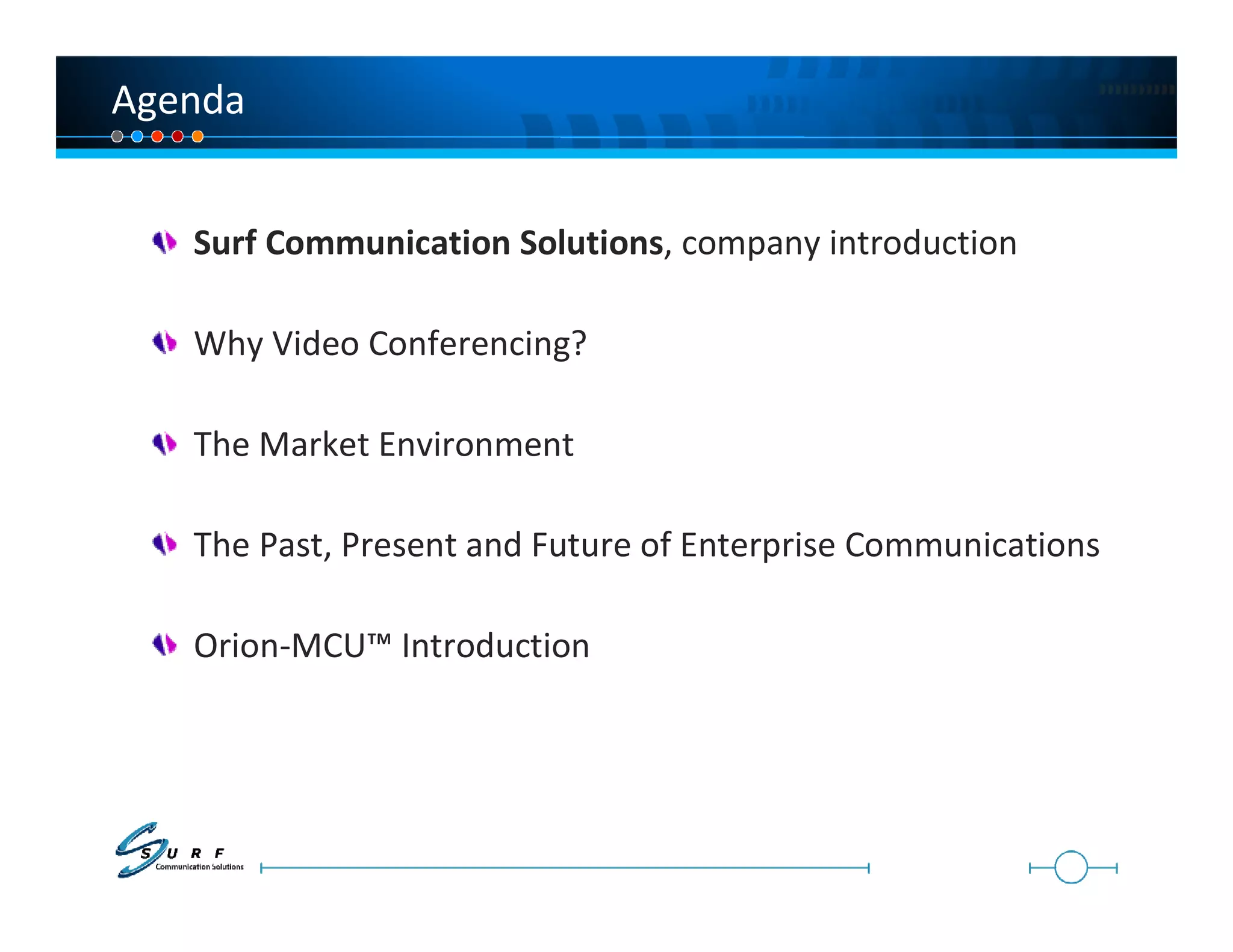 The document provides an overview of video conferencing solutions from Surf Communication Solutions, including their Orion-MCU product. It discusses the growing market for video conferencing and how Orion-MCU addresses interoperability challenges through its support for open standards. Orion-MCU is available as both a PCIe board and appliance and is designed for integration with Asterisk-based PBX systems to provide video conferencing capabilities.