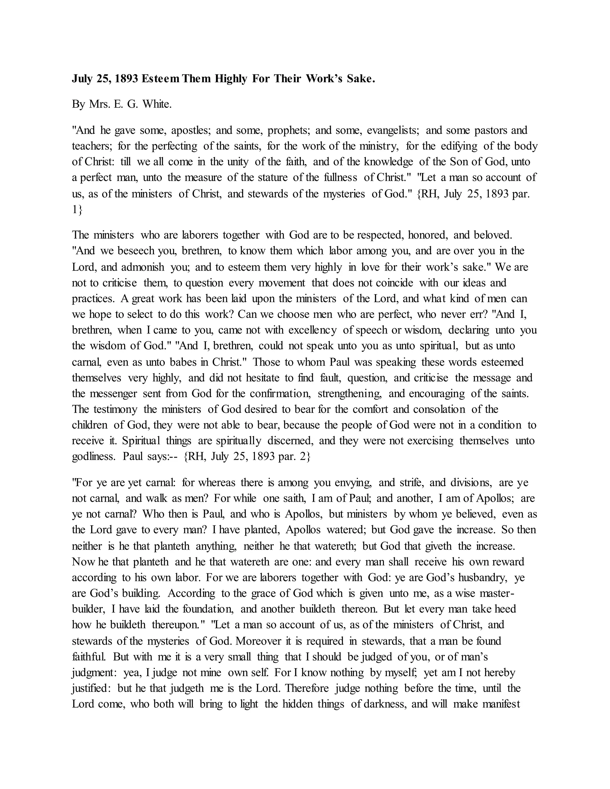 The document emphasizes the importance of respecting and supporting ministers of the gospel, as they are tasked with the spiritual development of the congregation. It warns against the extremes of idolizing ministers who don't confront sin and criticizing those who do, highlighting that both attitudes can lead to spiritual harm. Ultimately, it calls for unity, love, and genuine engagement with the spiritual guidance offered by those appointed by God.
