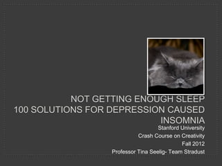 This document provides 100 solutions for insomnia caused by depression organized into emotional, spiritual, mental, and physical categories. It begins by stating that depression is a major cause of insomnia and lack of sleep. It then presents the solutions generated from a brainstorming session, organized into mind maps and categories. The solutions aim to help people suffering from depression and insomnia regain mental balance and sleep. The document was revised to further organize the solutions. It concludes by wishing the reader to sleep well.