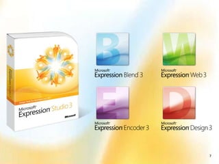 Expression Studio 3 is a suite of tools for designing and developing user experiences across multiple platforms. It includes Expression Blend for user interface design, Expression Web for web development, Expression Design for vector graphics, and Expression Encoder for video and audio encoding. Some key new features in Expression Blend 3 are improved prototyping with SketchFlow, behaviors for interactivity without code, and seamless integration with Visual Studio. Expression Web 3 adds a code editor, multi-browser debugging, and support for modern web standards and PHP. Expression Encoder 3 allows high quality screen capturing and optimized encoding for online delivery.