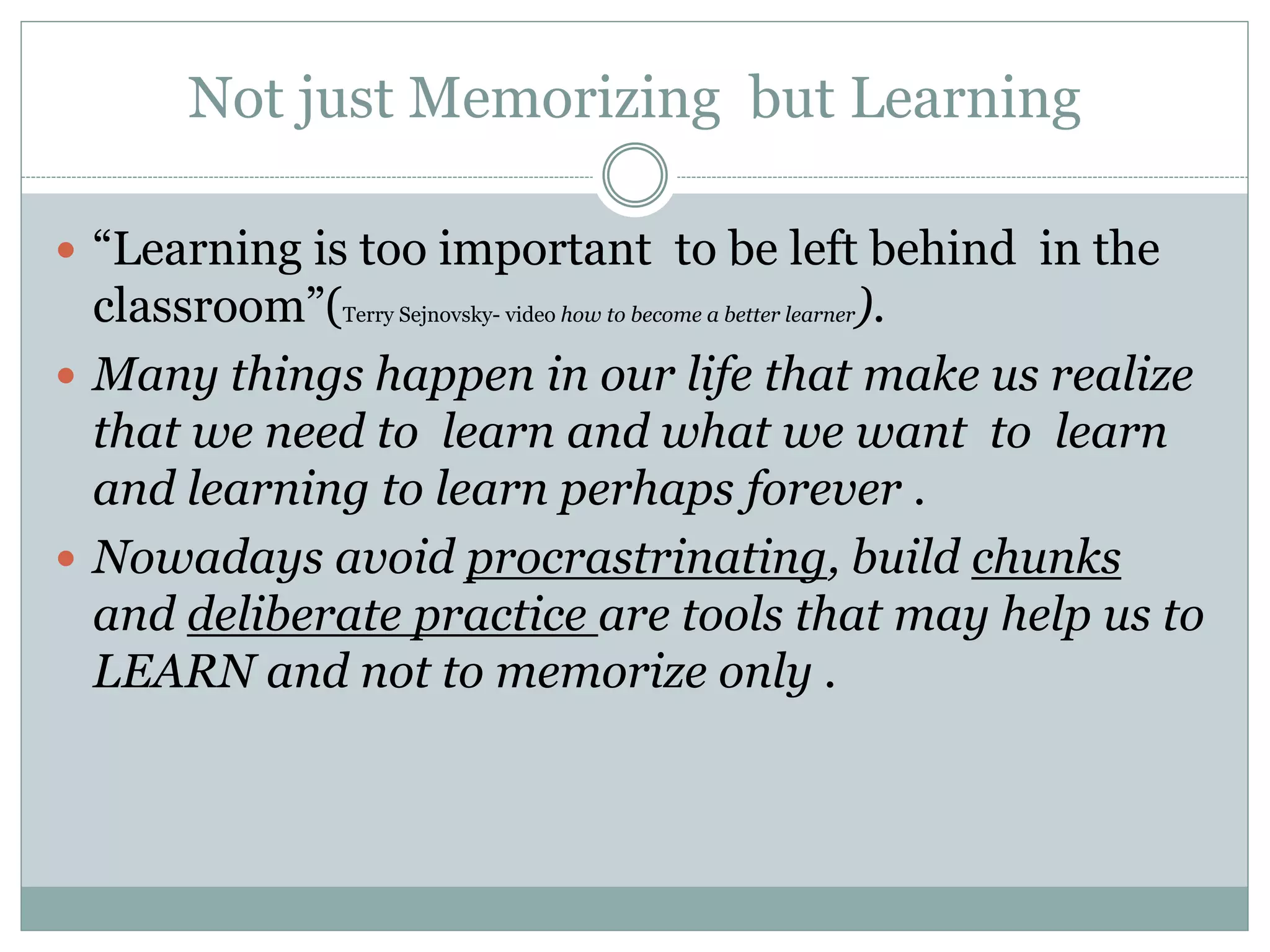 The document discusses strategies for learning rather than just memorizing. It recommends avoiding procrastination by using implementation intentions to link cues with specific planned actions. It also recommends learning in "chunks" by breaking large topics into smaller, meaningful pieces that can be mastered individually over time. Finally, it suggests using deliberate practice, where one focuses on practicing the hardest parts of what they are learning. These strategies can help people become better lifelong learners.