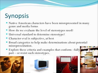 The document discusses the misrepresentation of Native American characters in comic books through the use of harmful stereotypes. It outlines several criteria to help evaluate the level of stereotyping, including examining the vocabulary used, how Native Americans speak and dress, whether they are portrayed as extinct or as either noble savages. The document provides specific examples from comic books that do and do not conform to these stereotypes. It argues for the need to recognize Native American humanity and diversity in comic book portrayals.