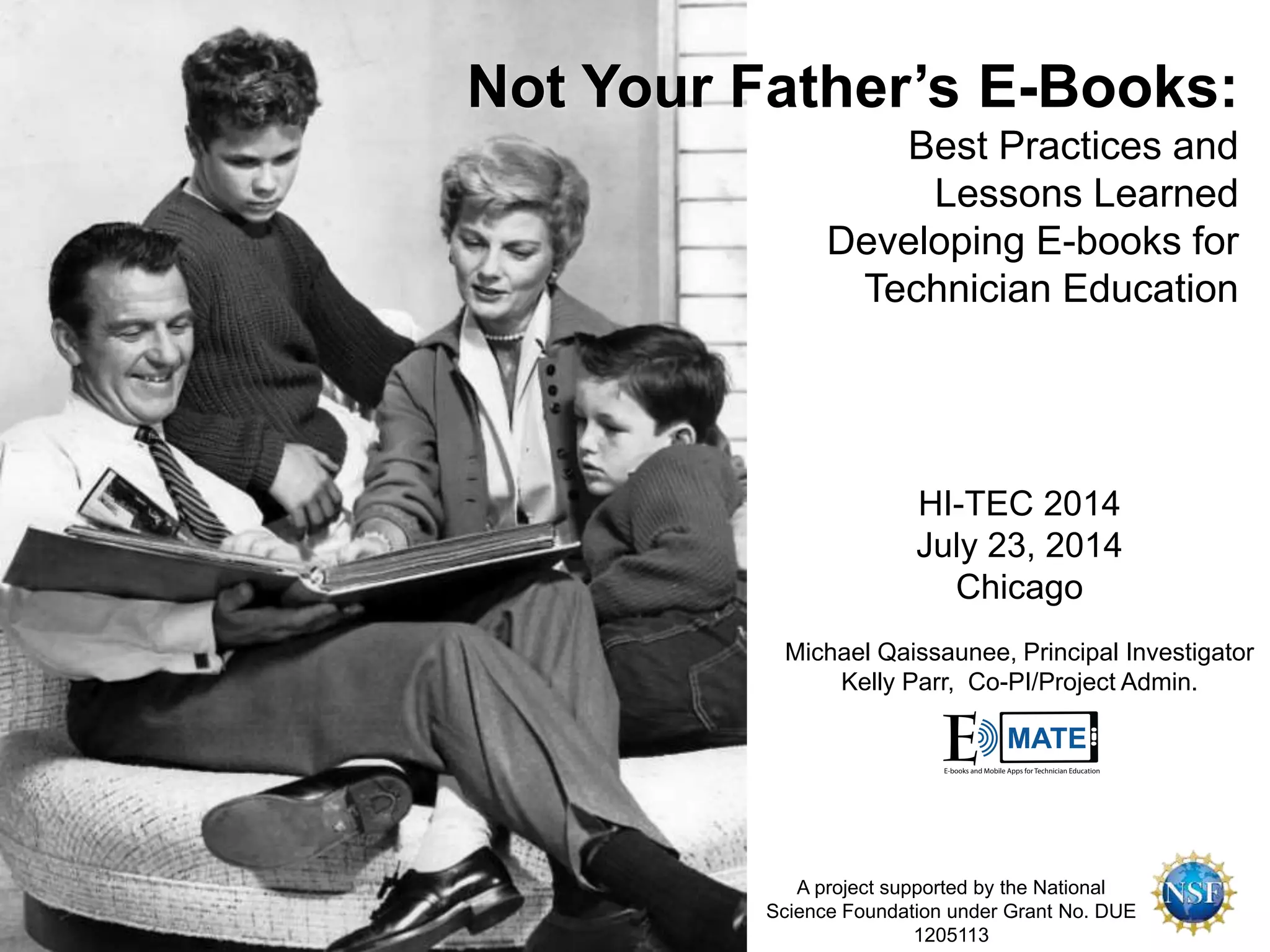 This document summarizes best practices and lessons learned from developing e-books for technical education. It recommends storyboarding content using post-it notes before building e-books. It also suggests experimenting with templates in iBooks Author before constructing e-books. The document highlights that widget options for e-books are growing and provides resources for widget creation software like iBooks Author, Tumult Hype, Book Widgets, and Bookry. It concludes by listing contact information for the project leaders.